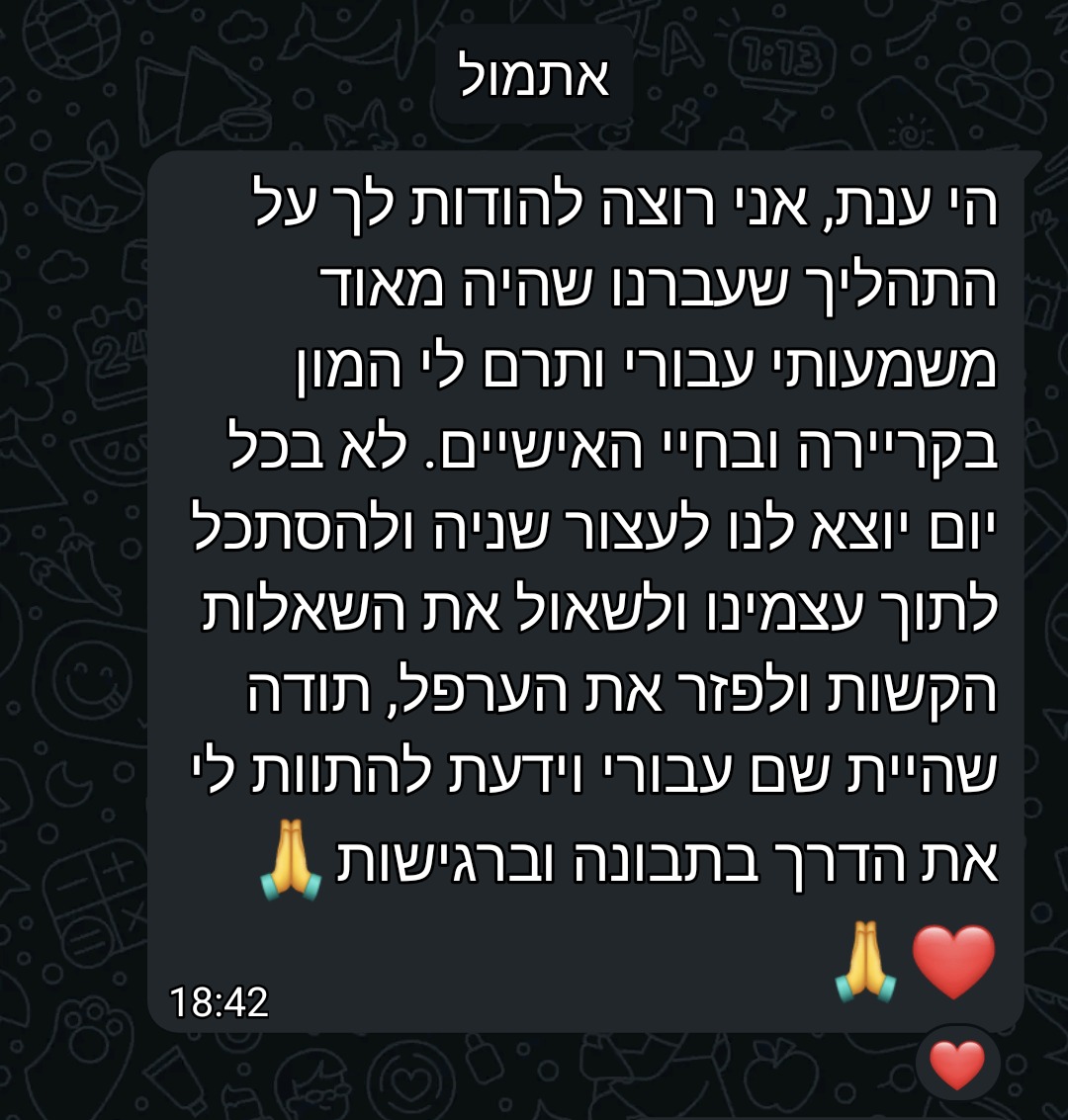 אני מזמינה אותך לפגישת היכרות אישית, בזום או פרונטלית – וללא התחייבות. מפגש שיכול להיות נקודת המפנה שלך.