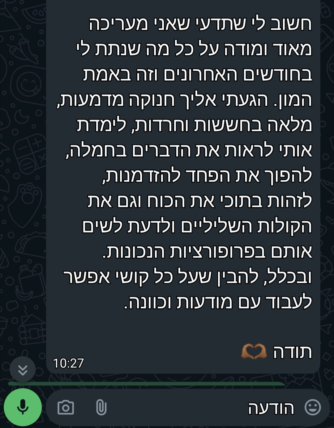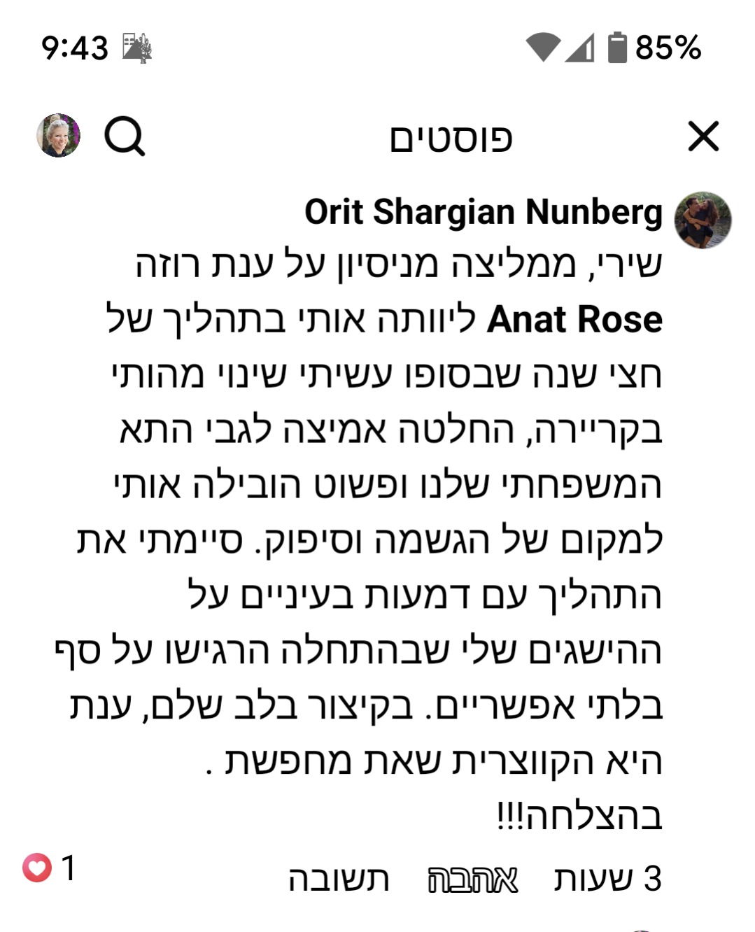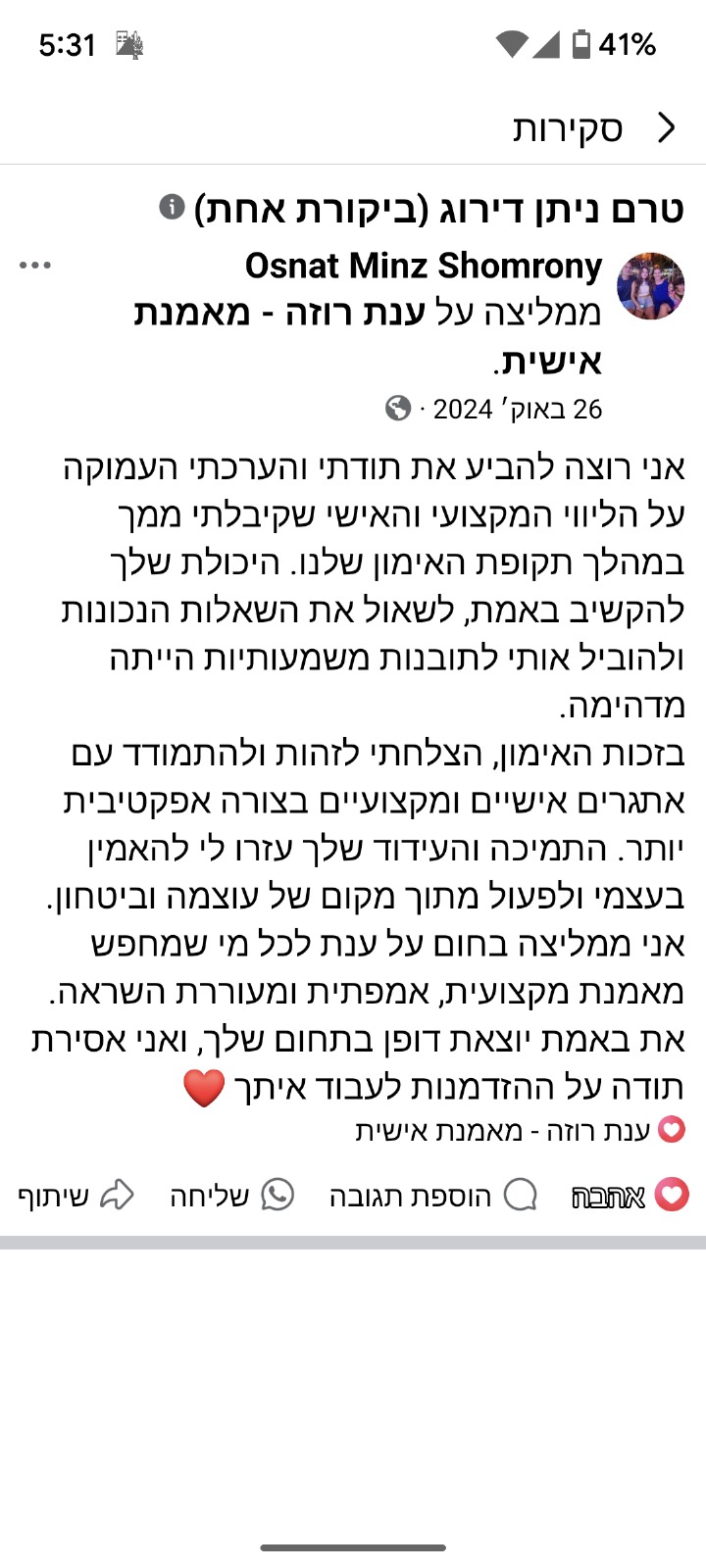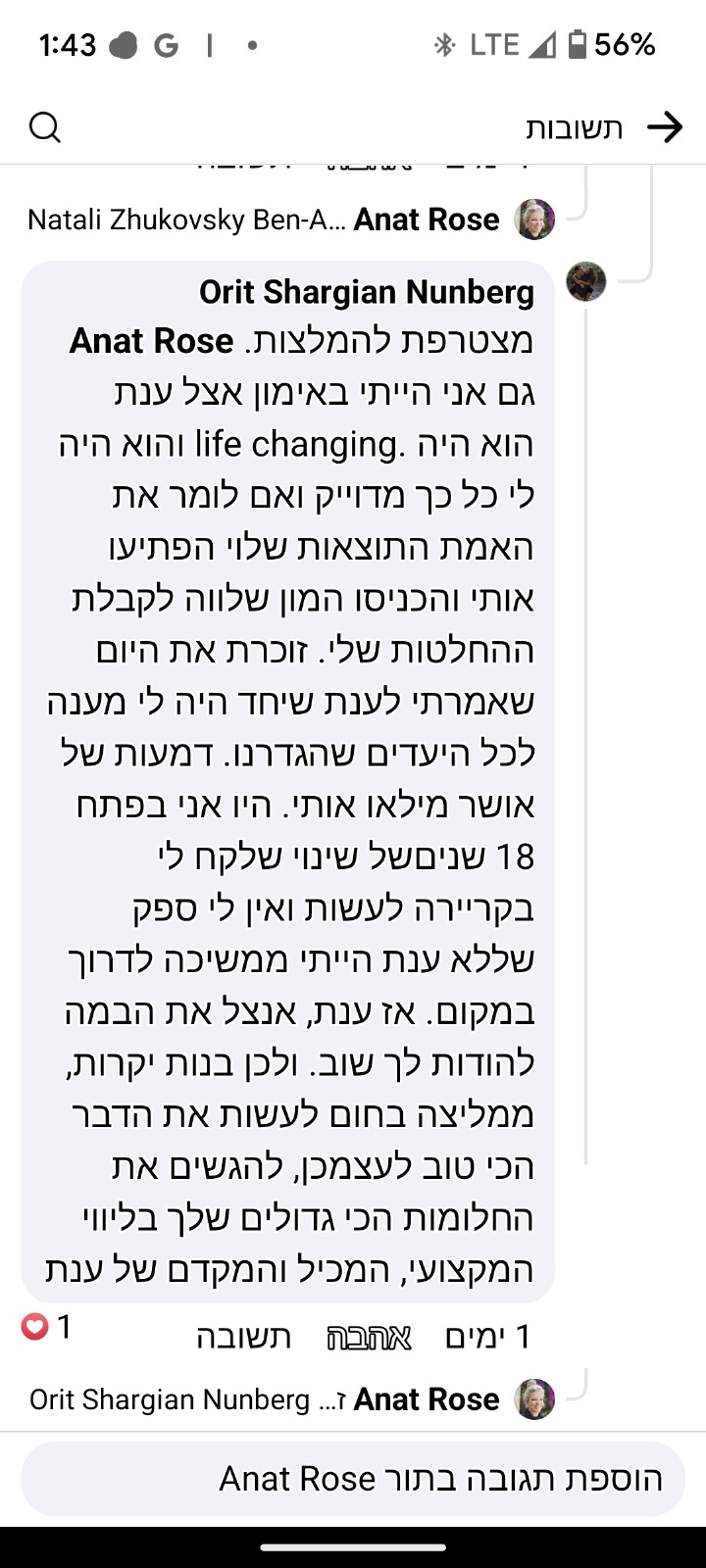 כי העולם מלא באנשים שמשתוקקים שמישהו יעודד אותם ויאמין בהם – האימון זה מה שאפשר לי להעיז לדמיין ולממש את הייעוד שלי כרקדנית וכמורה למחול אחרי גיל 45!